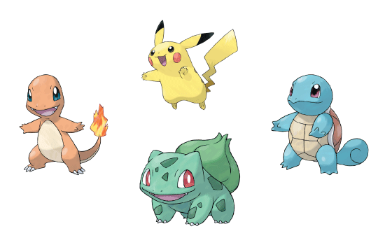 - Startpokémon: Bulbasaur, Charmander en Squirtle (Red en Blue) of Pikachu (Yellow)